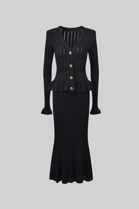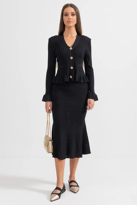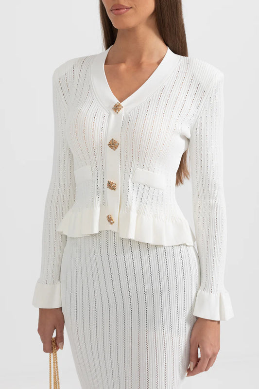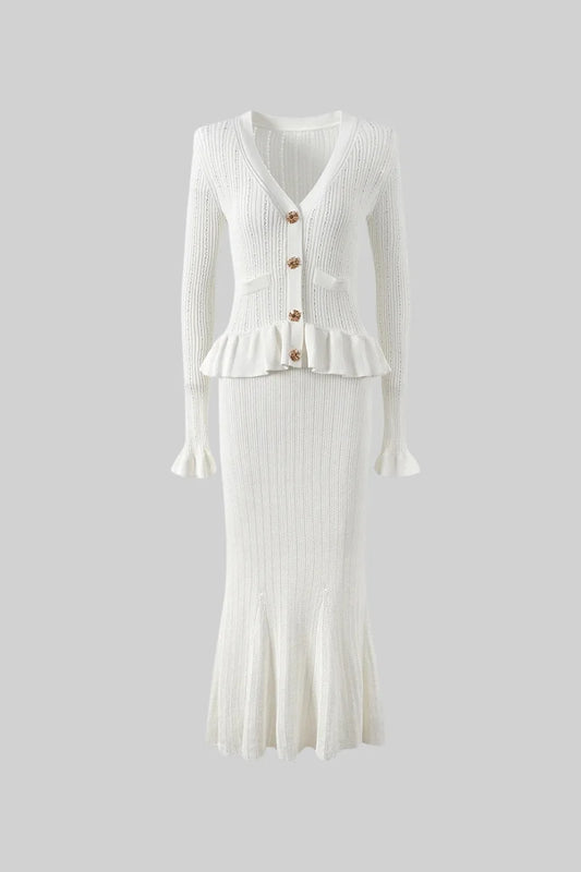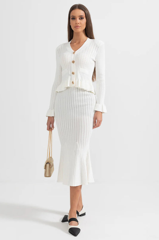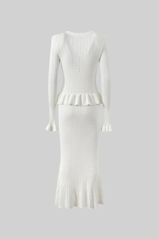 Ruffled Jacket & Flared Skirt Knit Matching Set - White