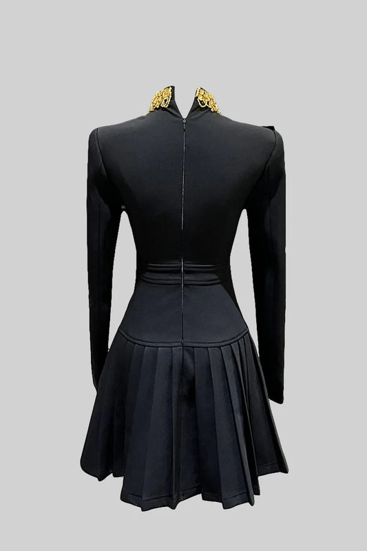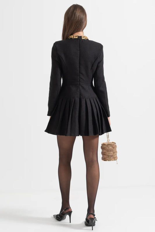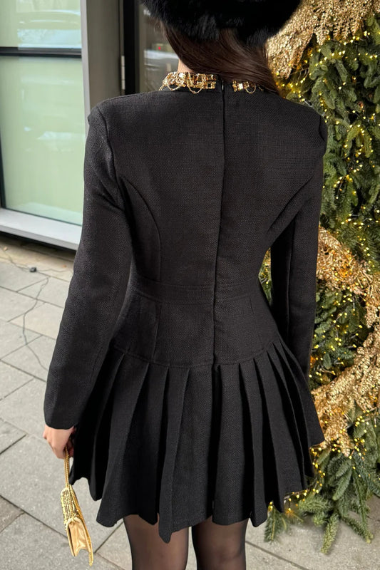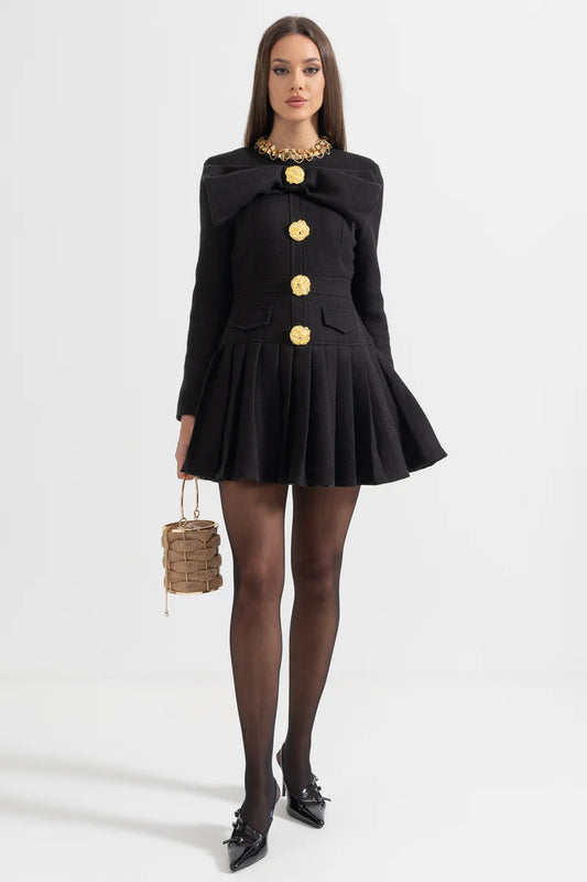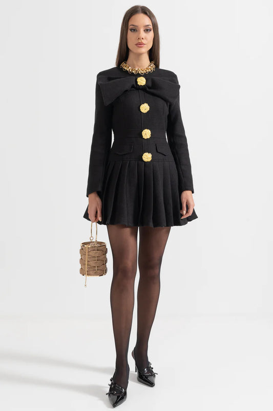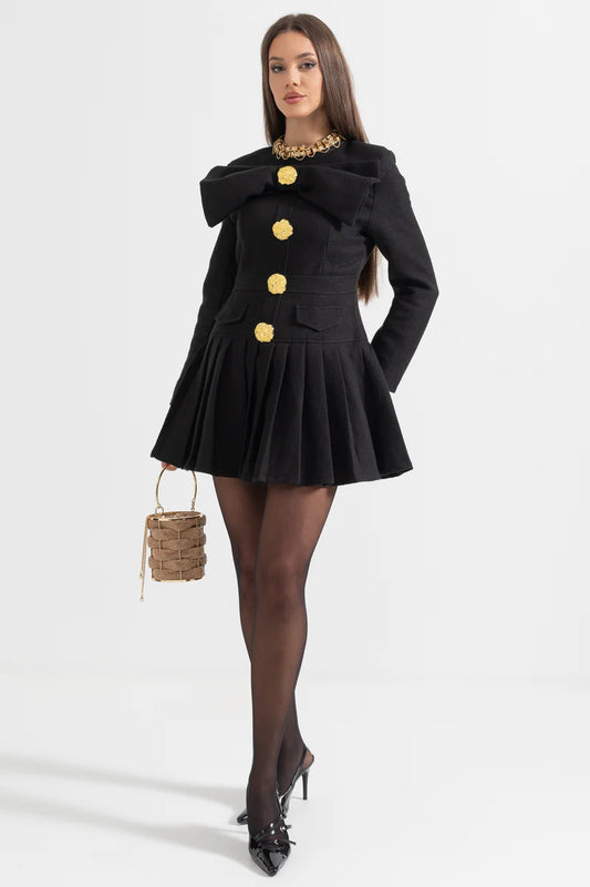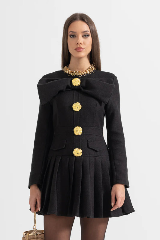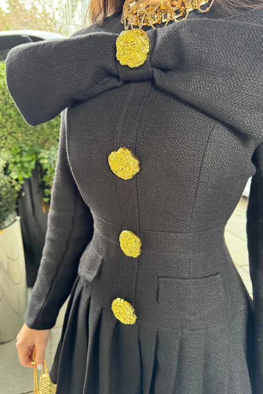 Büyük Dekoratif Altın Düğmeler ve Yaka Fiyonklu Siyah Düğmeli Elbise